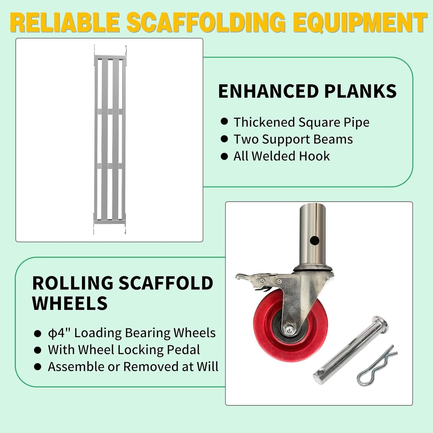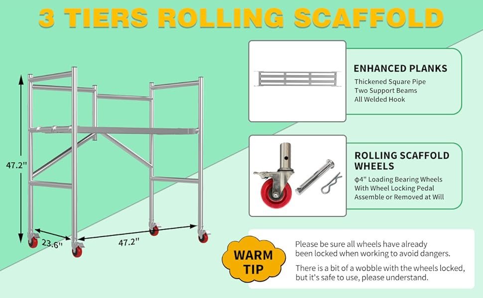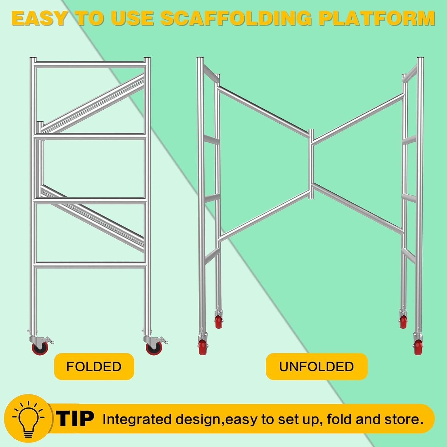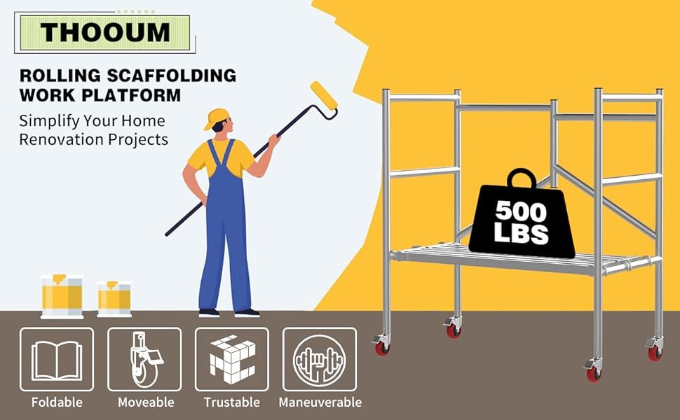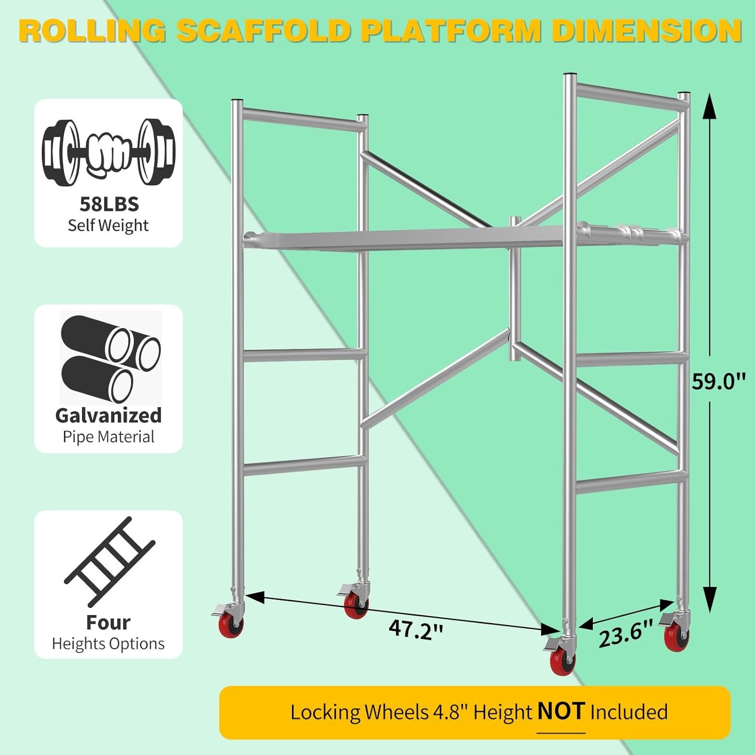 Strong Scaffolding Platform: Made of thickened galvanized pipe then fully welded, the sturdy frame & planks are strong enough to support up to 500LBs, gives you more confidence for interior home renovation projects.Useful Scaffolding Equipment : Instead of climbing up and down the ladder as much to get equipment, You could save more time and energy with work platform to place equipment. Make it convenient to do any home maintenance.Easy to Use Scaffold Set : With integrated design, the scaffold is easy to unfold when for working and fold up into a compact unit to store. It has 5 tiers, and you could choose where to place the pedals as per your need.Rolling Scaffolding Platform : The scaffold set comes with four locking wheels, you could simply roll on to the next area with the handy well built casters. In addition, you could choose to use the wheels or not at will.Widely Used Scaffold Platform : This scaffolding can be used both indoor and exterior. Suitable for building construction, interior painting, ceiling repair, changing light bulbs all these indoor/exterior remodel works.Manufacturer : AACE MEGAINFRA PVT LTDItem Weight : 67.9 poundsProduct Dimensions : 74 x 30 x 7 inchesItem model Number : 59 InchColor : SilverMaterial : IronIncluded Components : Ladder, Locking WheelBatteries Included? : NoBatteries Required? : NoWarranty & SupportGoogifyme.com Return Policy:Googifyme.com Voluntary 30-Day Return Guarantee: You can return many items you have purchased within 30 days following delivery of the item to you. Our Voluntary 30-Day Return Guarantee does not affect your legal right of withdrawal in any way. You can find out more about the exceptions and conditions.